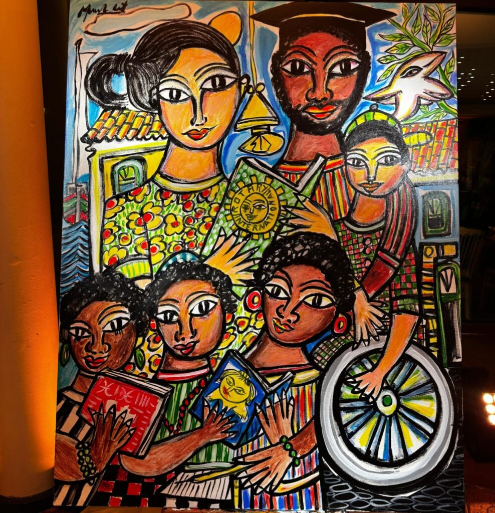 A composição retrata educadores em atitude de acolhimento ao lado de crianças de diferentes origens, incluindo uma criança cadeirante, reforçando a importância do cuidado, da convivência e do pertencimento. A proposta artística dialoga diretamente com valores como inclusão, empatia e responsabilidade social, temas recorrentes no trabalho de Menelaw Sete.