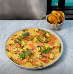 Entre as entradas, o destaque vai para o Tiradito de Salmão, preparado com aguachile de cajá, tartare de abacate com manga e tostones, e o Pastel de Mariscada, recheado com frutos do mar e servido com pimenta da casa.